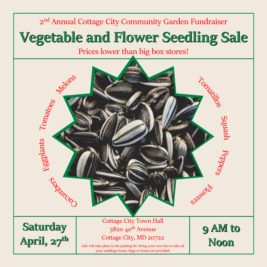 Buy your veggie plants locally and help us raise funds for the Cottage City Community Garden for our 2nd Annual Seedling Sale and Fundraiser!